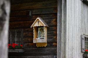 Der Bildstock ist auf der Hauswand der Bräualmhütte befestigt.