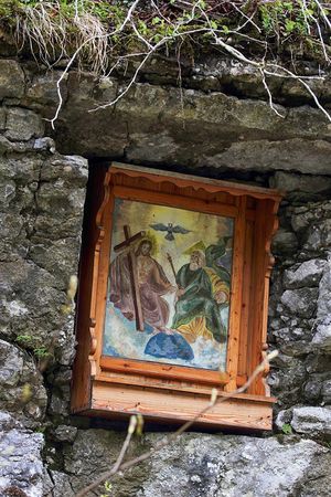 Die Tafel hängt in einer Felsnische am Kalvarienweg zur Wallfahrtskirche Maria Kumitz.