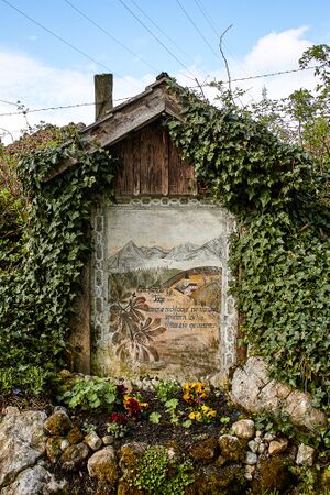 Der Bildstock steht an der linken Straßenböschung, ist mit Efeu bewachsen und von einem Holzdach geschützt.