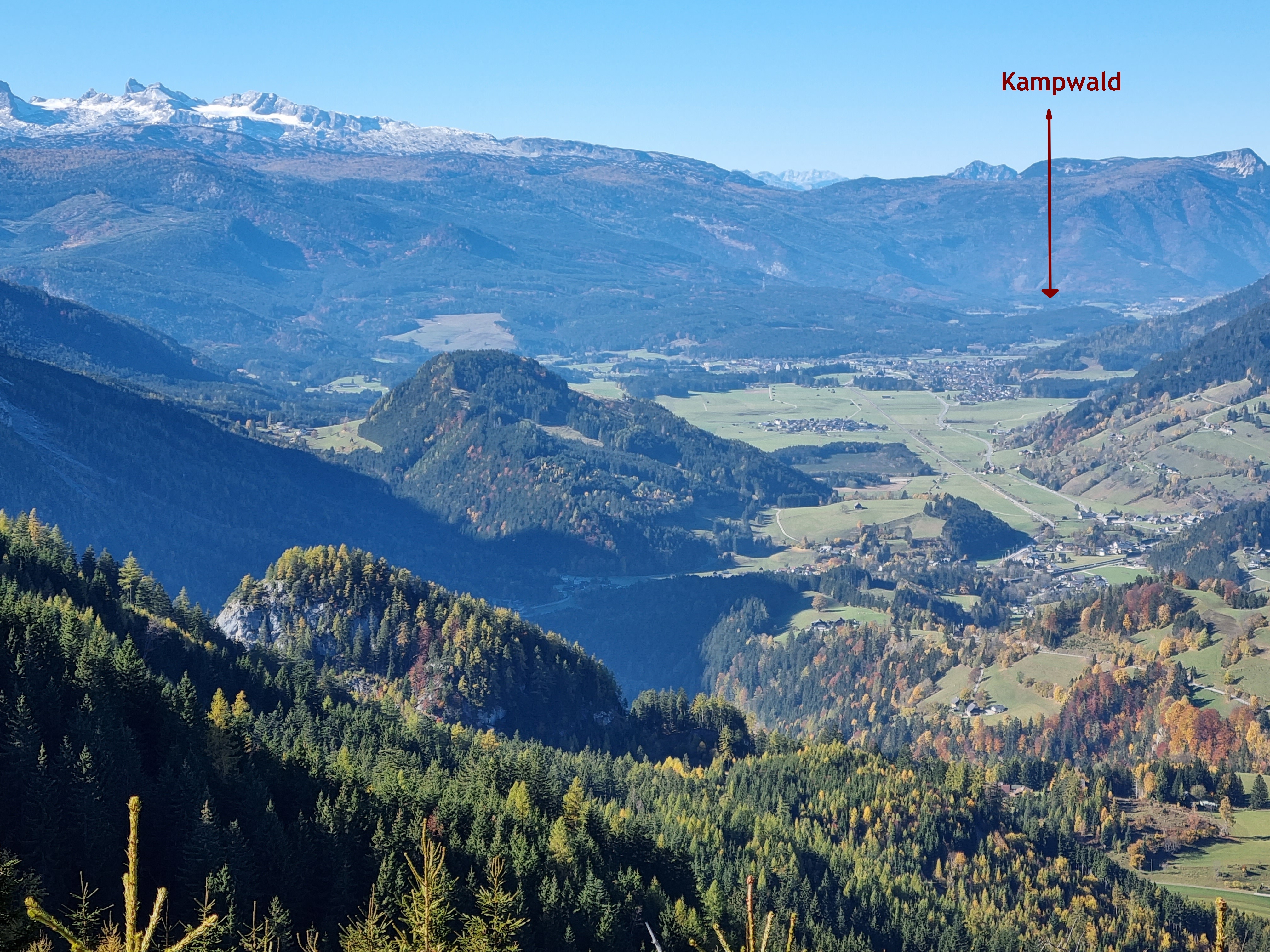 - Blick von Osten in das Hinterbergertal im steirischem Salzkammergut. Durch das Hinterbergtal führte die Römerstraße, in deren Umfeld der "Silberschatz vom Kampwald" in Bad Mitterndorf gefunden wurde. Der Pfeil zeigt den Kampwald.
