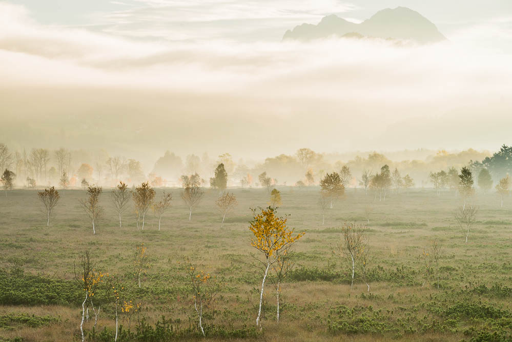 Pürgschachener Moor im Nebel mit Buchstein im Hintergrund.