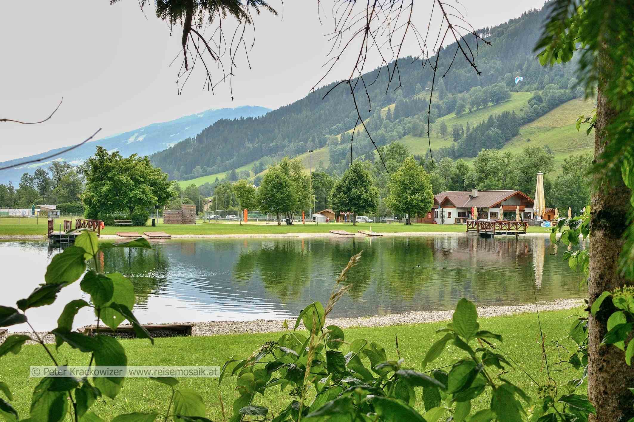- Freizeitsee Pichl in Pichl, Schladming mit der Hochwurzen im Hintergrund.