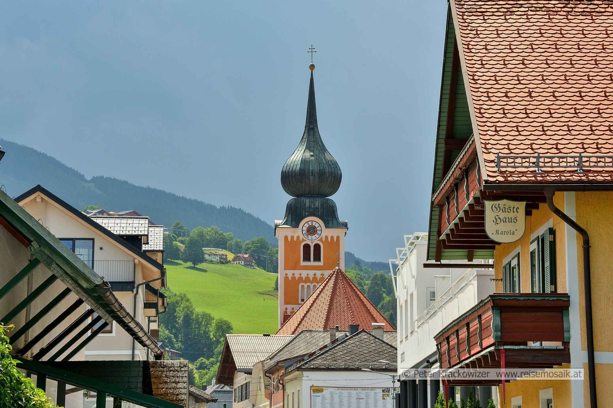 Die katholische Stadtpfarrkirche hl. Achaz in Schladming vor dem Hintergrund einer drohenden Regenfront.