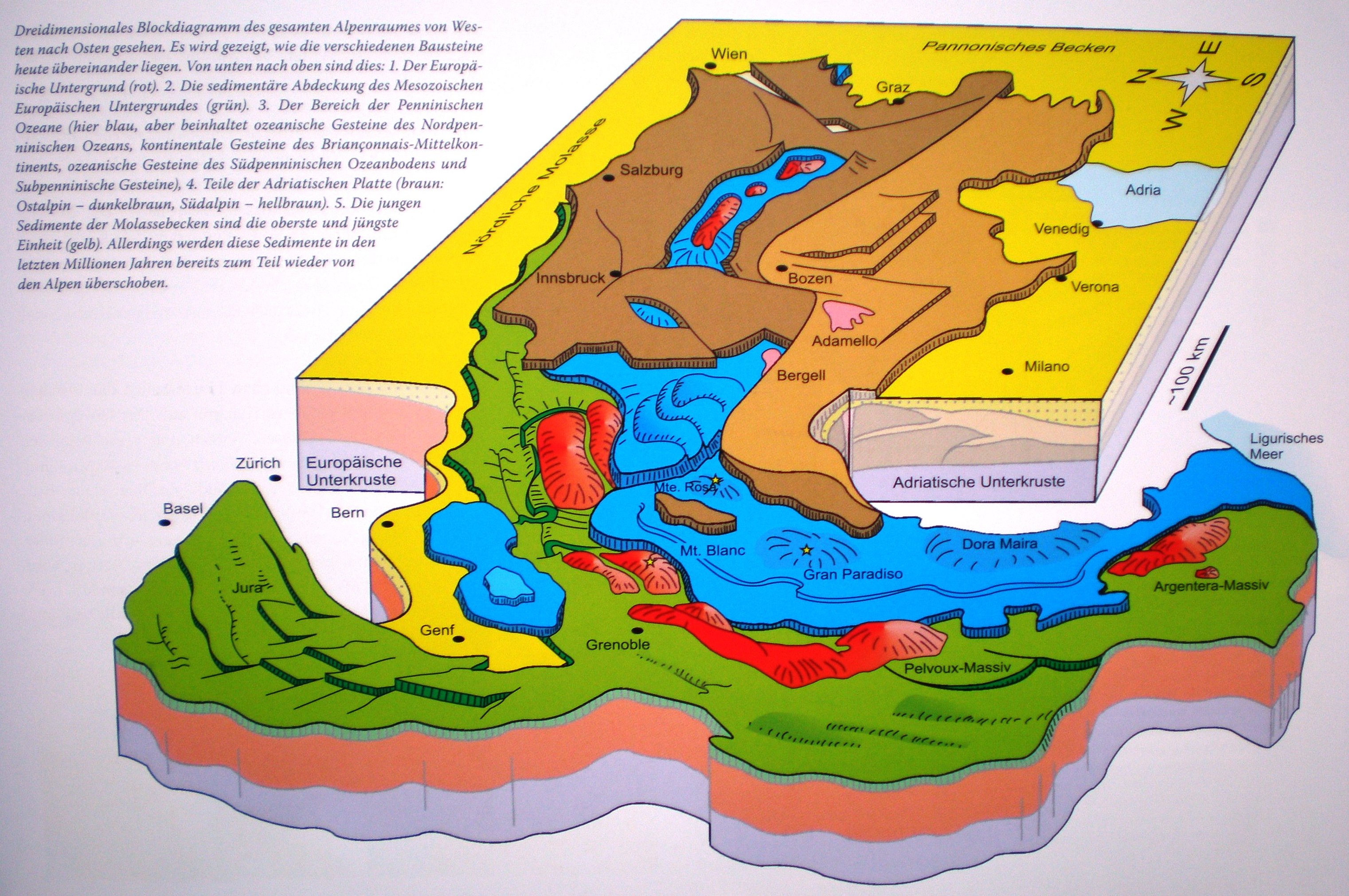 3D-Blockmodell der Alpen (Legende siehe Bild)