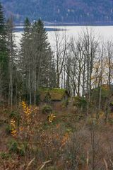 - Bei der Seewiese Altaussee am Altausseer See im steirischen Salzkammergut im Ausseerland. Blick auf die beiden Gebäude.