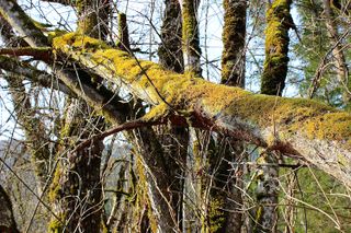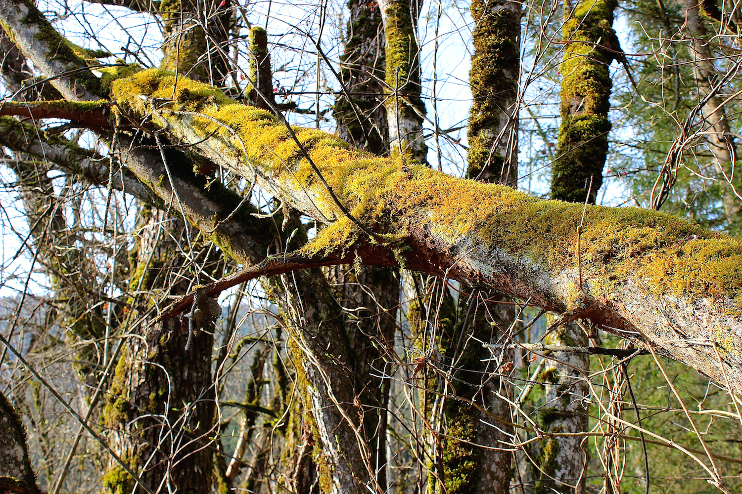 Eine alte, bemooste Grauerle ist wegen Schneebruchs, Sturmeinfluss oder aus anderen Gründen umgebrochen und wurde von Stämmen benachbarter Grauerlen und Silberweiden stützend aufgefangen. Das Foto wurde im Auwald des Europaschutzgebietes Gamperlacke südöstlich von Liezen aufgenommen.
