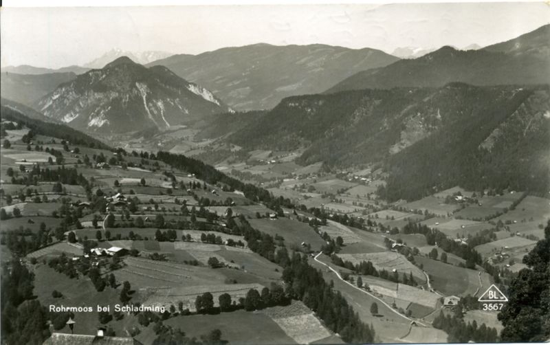 - Historische Postkarte von Rohrmoos-Untertal: rechts unten das Ennstal, Blickrichtung Salzburger Land (ennsaufwärts). Rechts auf der Geländekante die Ramsau.