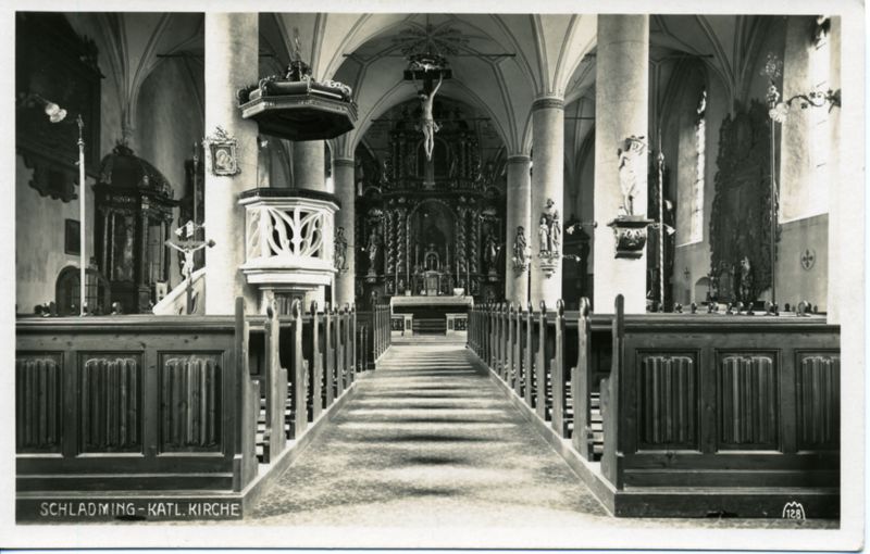 - die Katholische Stadtpfarrkirche hl. Achaz, historische Postkarte von Schladming