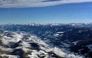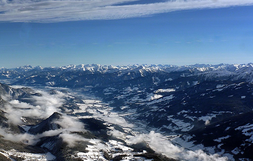 - Die Niederen Tauern, davor das Ennstal. Der Blick fällt von einer Ballonfahrt über der Ramsau nach Osten.