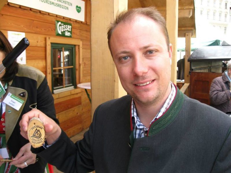 - Mathias Schattleitner , Geschäftsführer Schladming-Dachstein Tourismusmarketing GmbH mit seinem Holzei