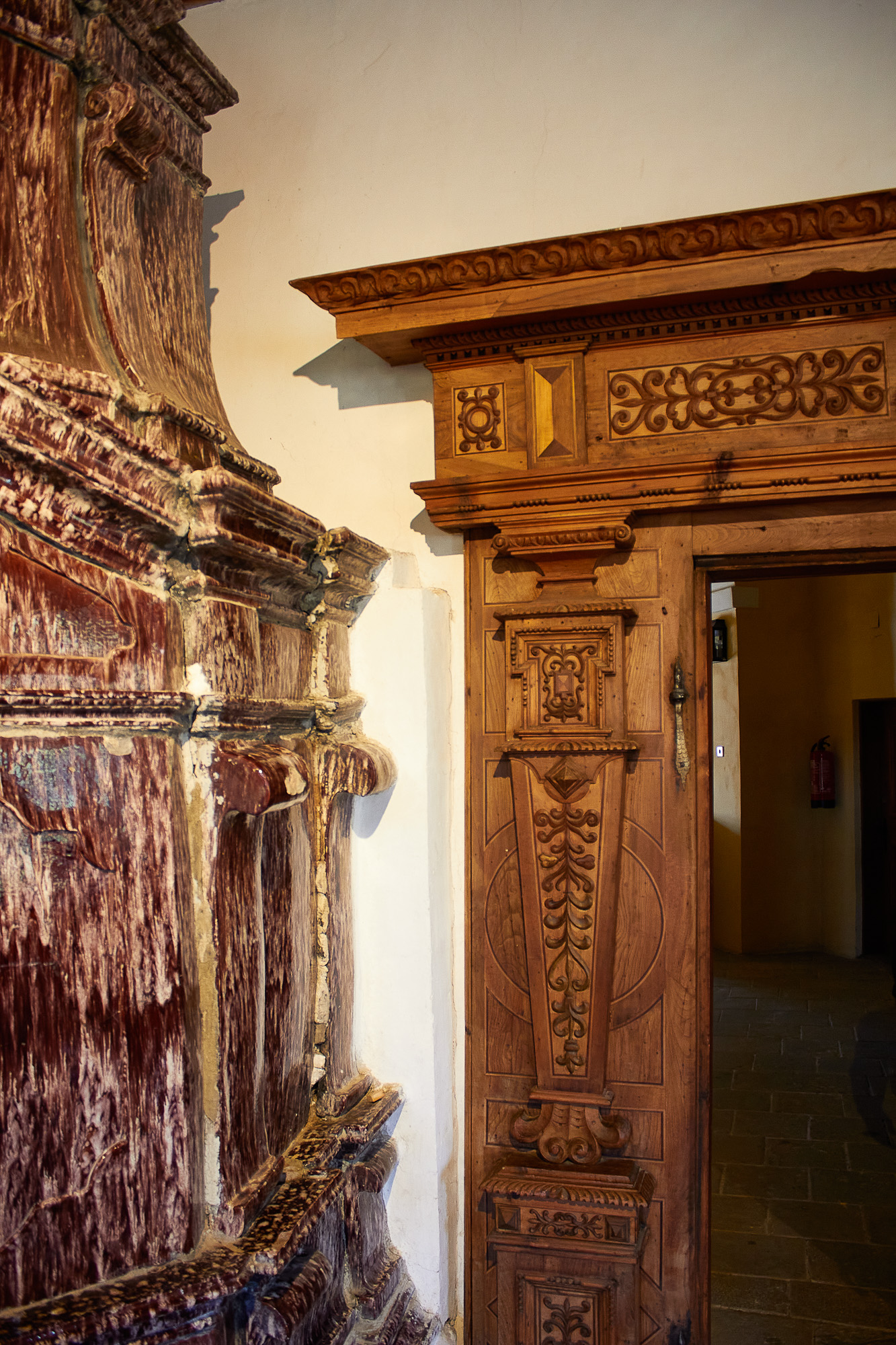 - Barocke Tür mit Kachelofen, Burg Strechau-Interior auf der Burg Strechau