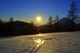 In der Nachmittagssonne glänzende Skifahrer Spur... Aufgenommen in Ramsau am Dachstein