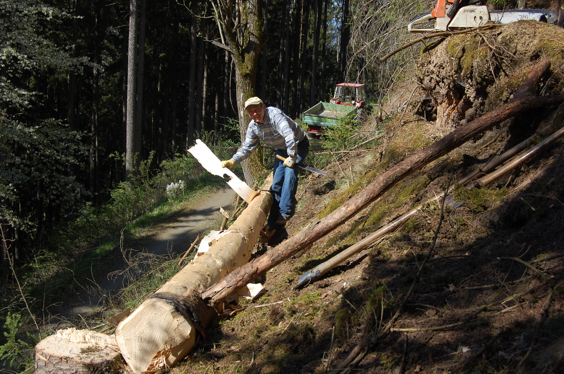 - Maibaum: "schinden", d.h. die zu dieser Zeit im Saft befindliche Rinde abschälen