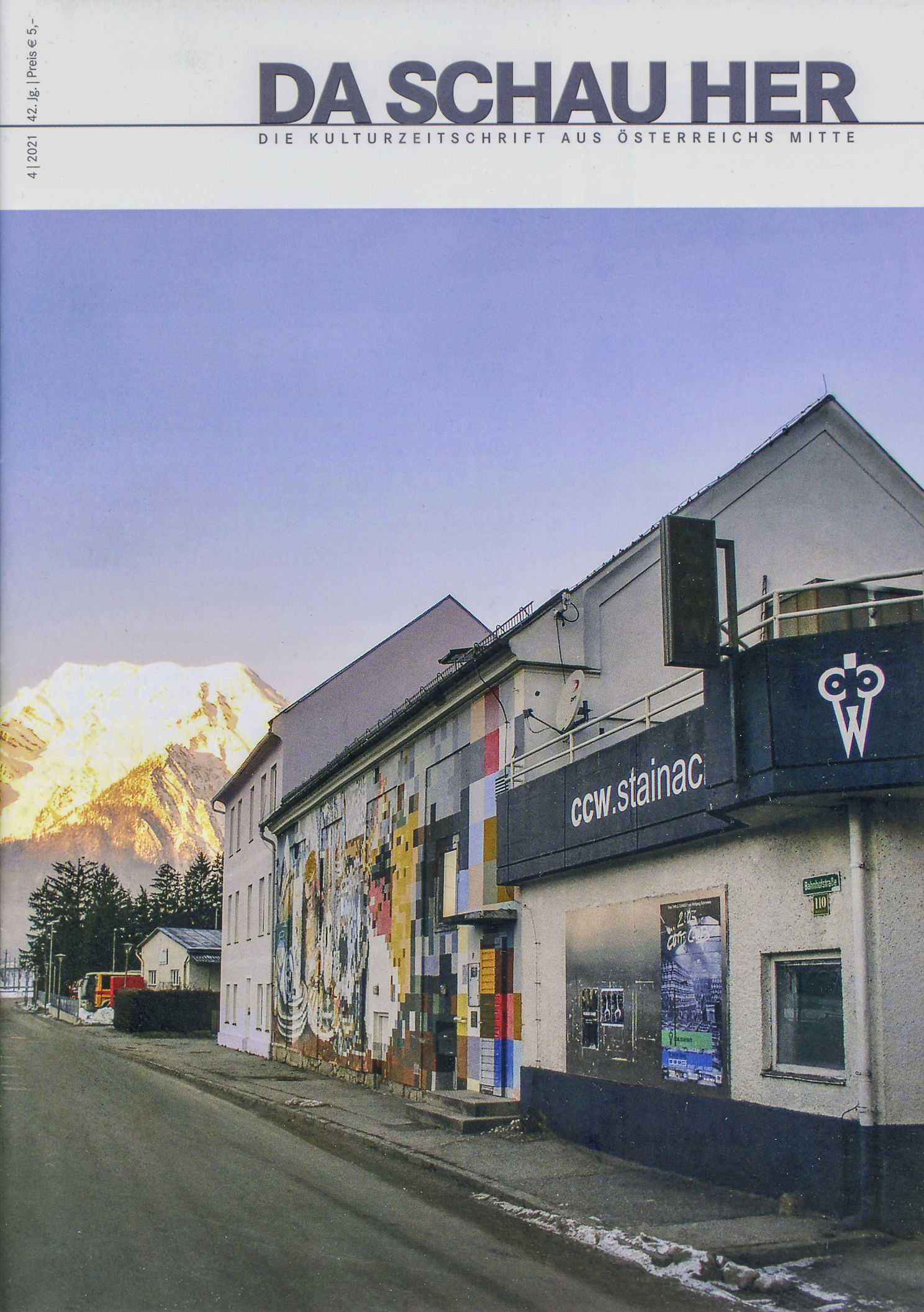 - Titelbild Da schau her 2021 Ausgabe 4. Es zeigt das Gebäude des Vereins Culturcentrum Wolkenstein in Stainach.