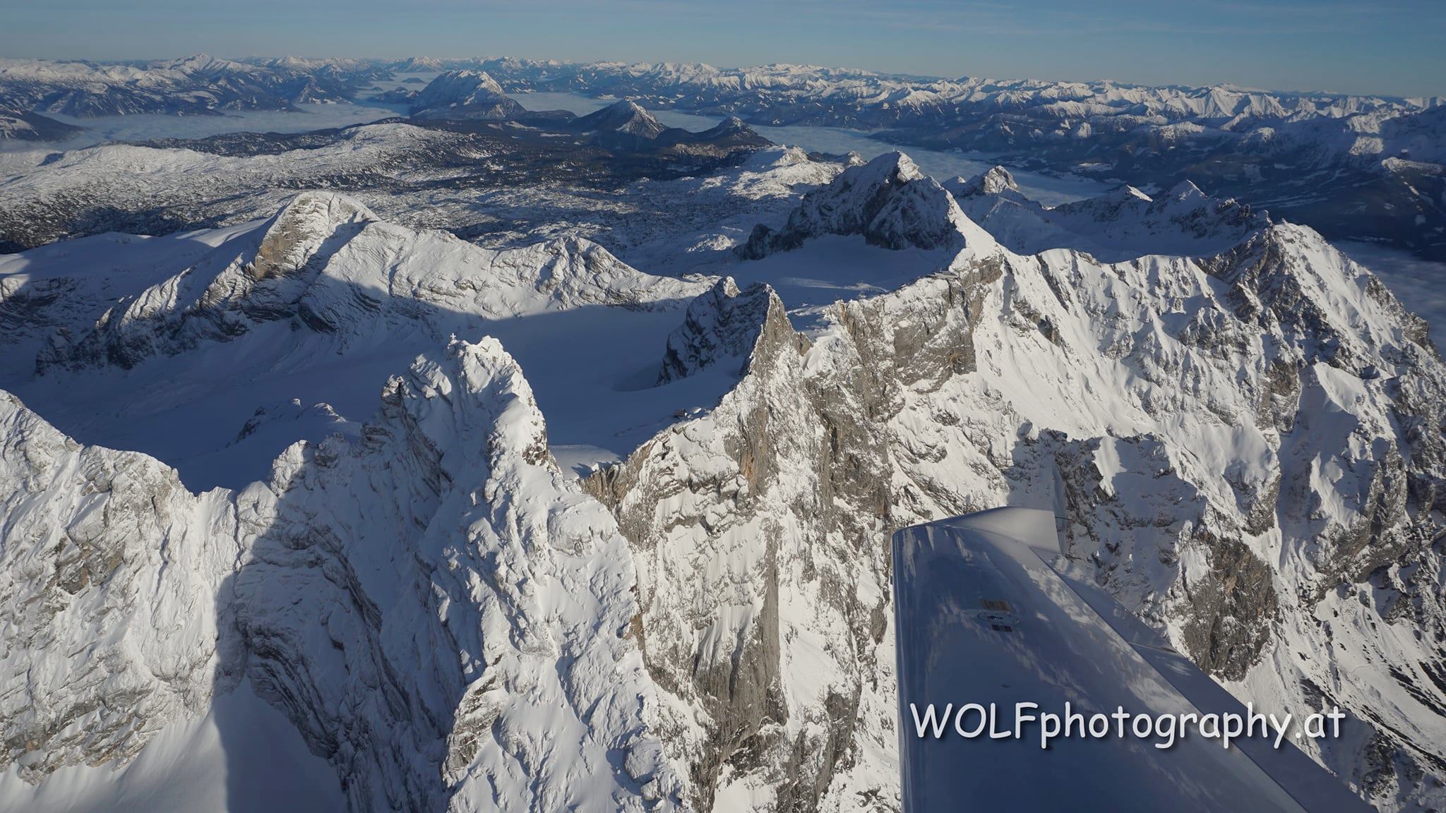 Im linken Bildteil der höchste Berg Oberösterreichs, der Hohe Dachstein, dann rechts unten die Dachsteinwarte mit der Seethalerhütte, aufwärts ragen dann die Dirndln in die Höhe und rechts auf dem ebenen Rand steht auf dem Hunerkogel die Bergstation der Dachstein Gletscherbahn, dahinter erhebt sich der Koppenkarstein. Rechts unten das Ennstal, rechts davon die Schladminger- und die Wölzer Tauern. Links ragt der Hohe Gjaidstein empor der das dahinterliegende Karsthochplateau "Auf dem Stein" begrenzt, das bis weit nach Nordosten ins Ausseerland ragt. In der Bildmitte im Hintergrund erkennt man nochmals einen größeren Berg, das ist der Grimmingstock und links unter dem Nebelmeer das Hinterbergertal mit Bad Mitterndorf und Tauplitz.