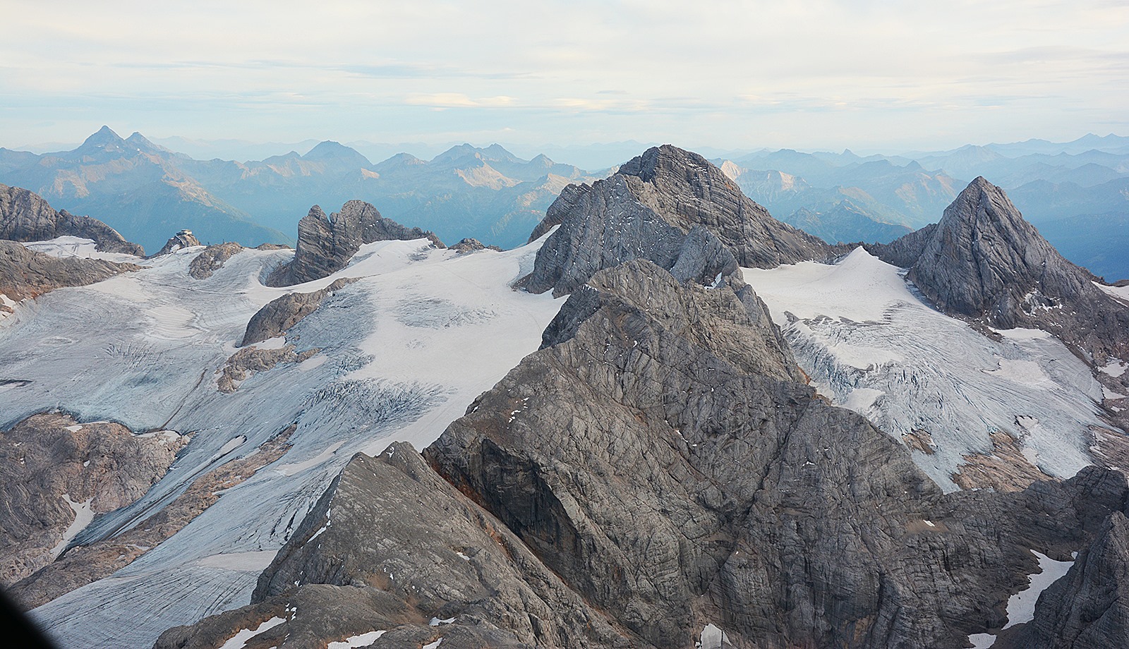 - Blick auf die Gletscher des Dachsteinmassivs von Norden: von links: am Hunerkogel die Bergstation Hunerkogel der Dachstein Gletscherbahn, darunter Hallstätter Gletscher, die Dirndln, Hoher Dachstein, davor der Niedere Dachstein und die Steinerscharte, dann rechts Großer Gosaugletscher und Mitterspitz.