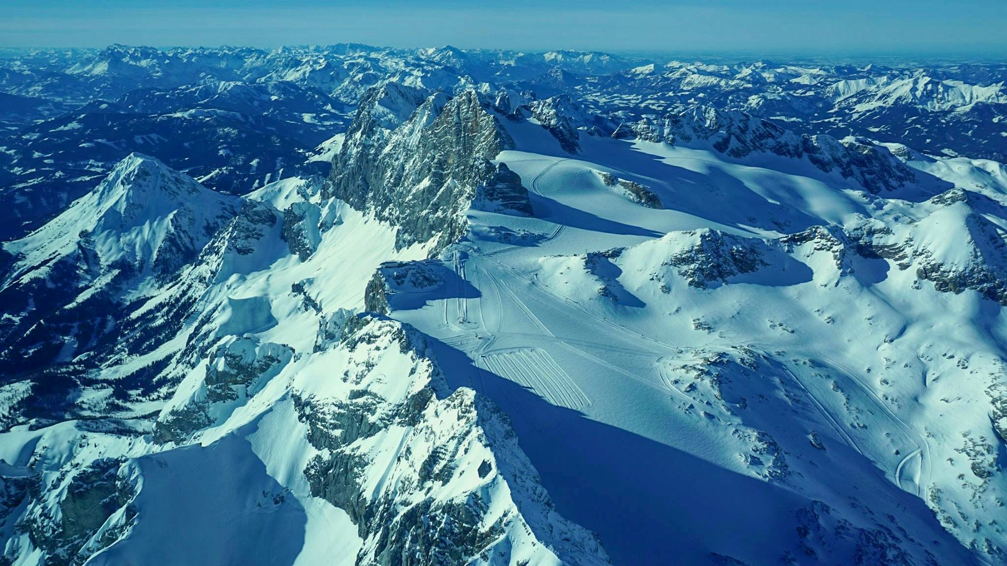 - Im dunklen Fleck in der Bildmitte befindet sich der Bergstation Hunerkogel der Dachstein Gletscherbahn, links im Tal die Ramsau, im Vordergrund der Hallstätter Gletscher mit dem Gletscherskigebiet im oberösterreichischen Obertraun. Am unteren Bildrand sieht man denGroßen Koppenkarstein.