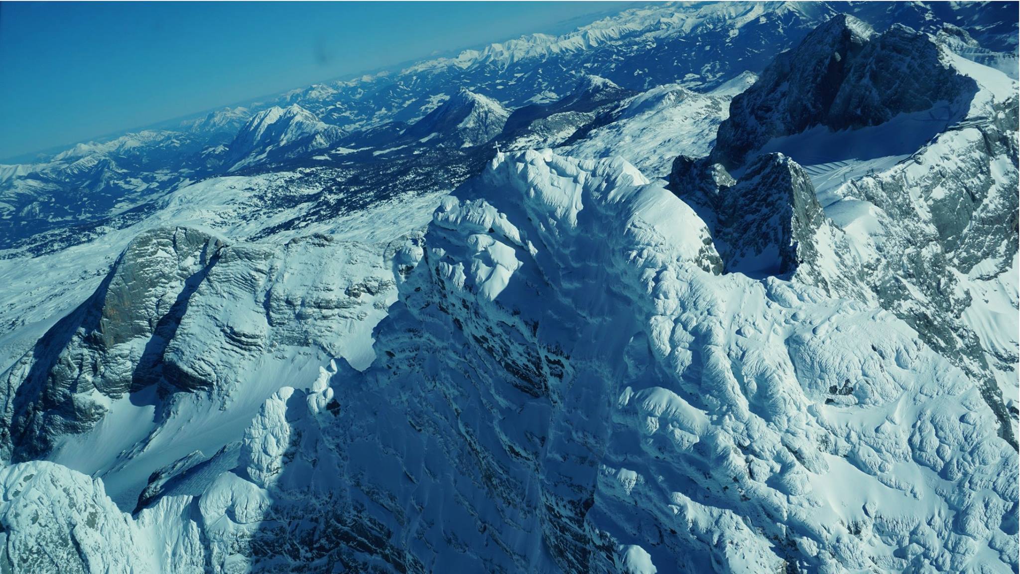 - Dachsteinmassiv: Blick leicht von Nordost auf den Hohen Dachstein mit seinem Eispanzer an den Flanken, rechts davon die Dirndl, dann ganz am Bildrand rechts die Bergstation Hunerkogel der Dachstein Gletscherbahn und dahinter der Große Koppenkarstein. Links der Felsen ist der Hohe Gjaidstein und genau über diesem im Hintergrund der Grimmingstock, links davon erstreckt sich das Hinterbergertal und das Ausseerland, links davon verläuft das Ennstal in dessen Hintergrund man die Wölzer und Rottenmanner Tauern (rechts) sowie die Ennstaler Alpen (Bildmitte und links) erkennen kann.