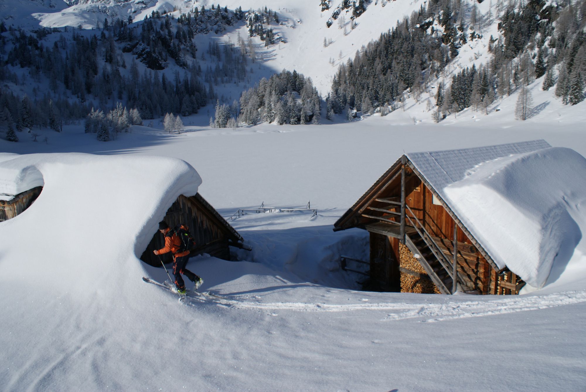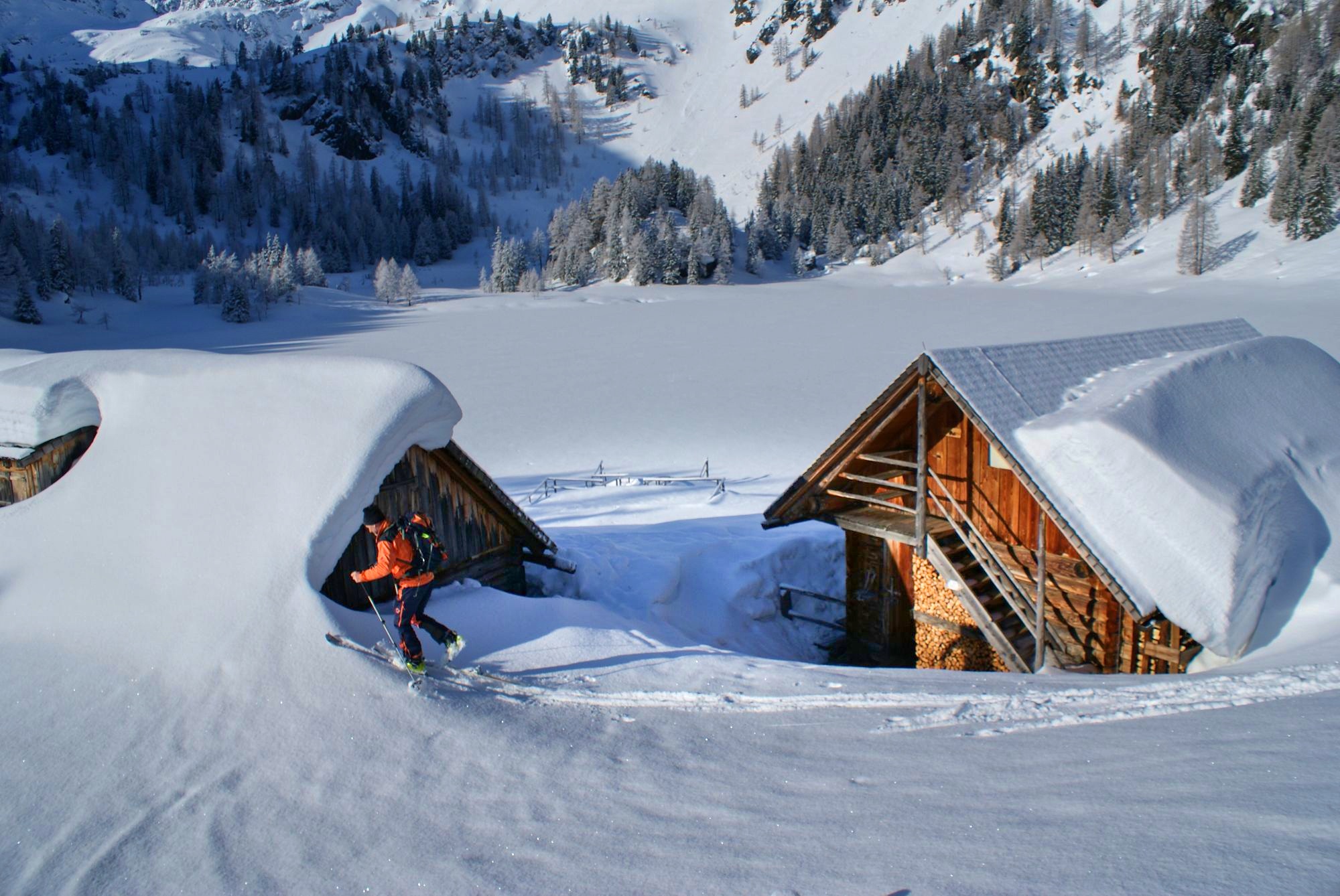 - Die Fahrlech-Hütte mit dem verschneiten Duisitzkarsee im Hintergrund.