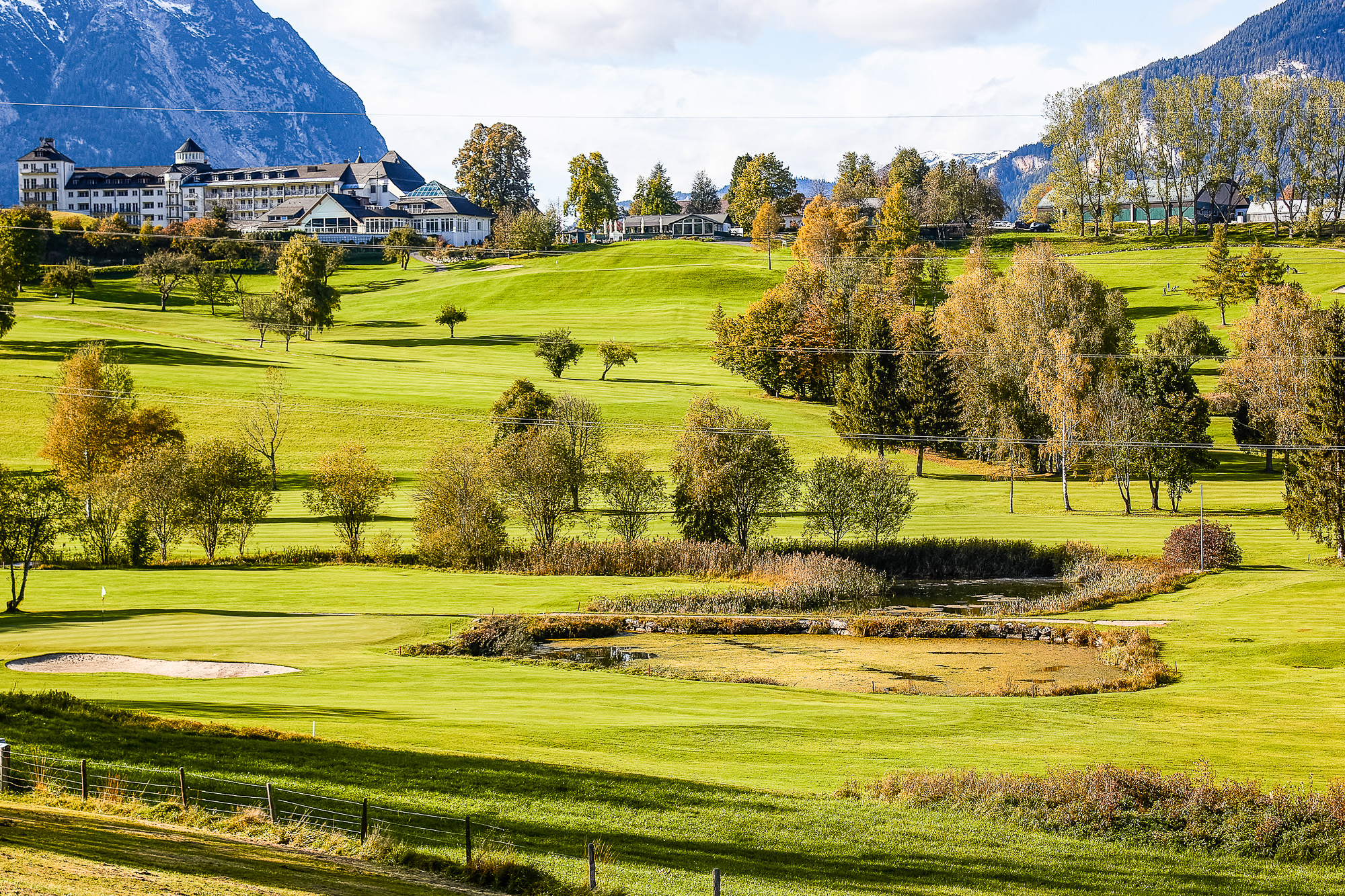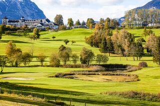 - der Golf- & Country Club Schloss Pichlarn in Aigen im Ennstal, im Hintergrund das Imlauer Hotel Schloss Pichlarn
