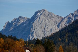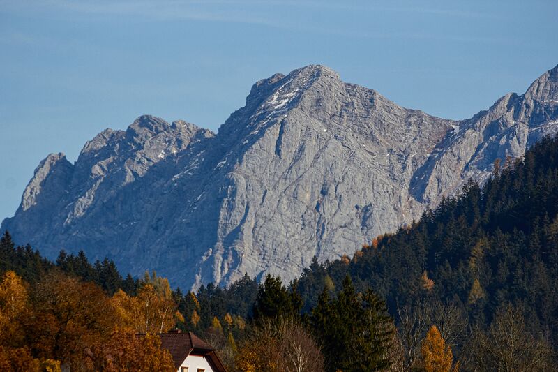 - Bildmitte der Große Buchstein, links dahinter die Admonter Frauenmauer, von Admont gesehen.