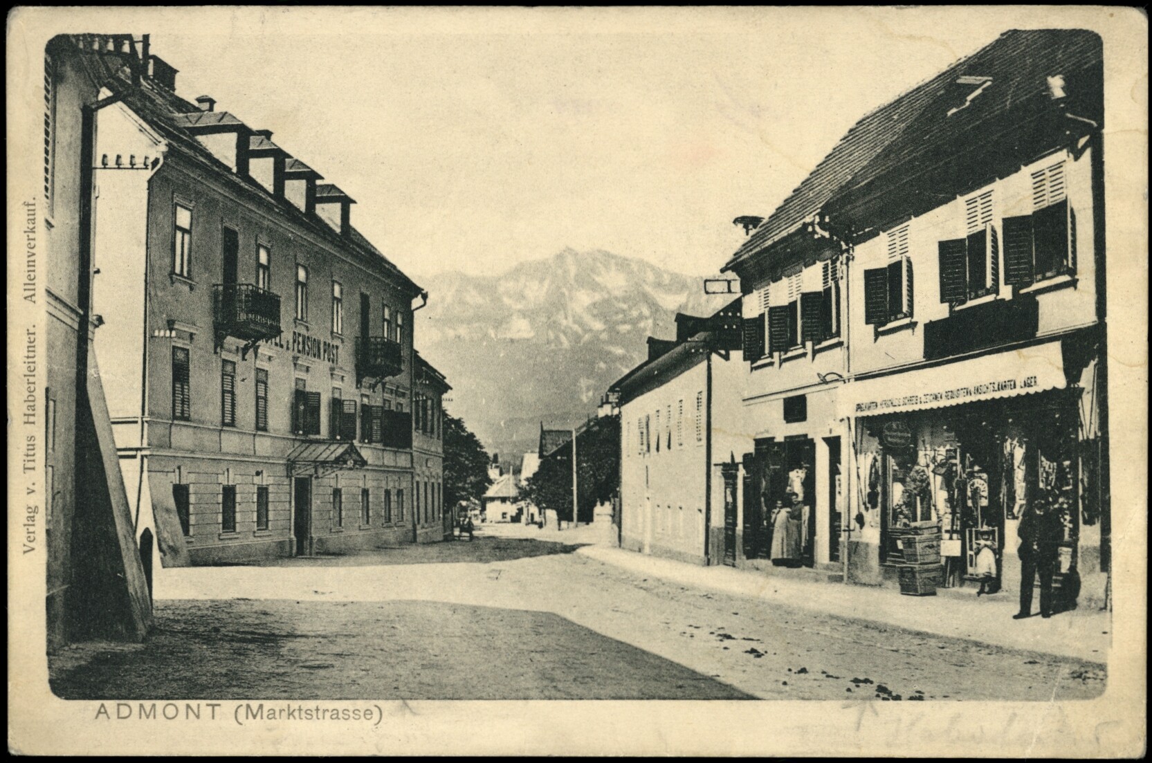 - Haberleitner (rechts) und Hotel und Pension "Zur Post" (links) in Admont, historische Ansichtskarte;