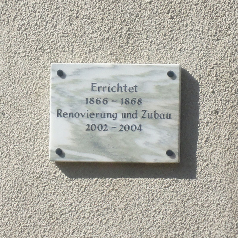 - Informationstafel an der Frontseite des evangelischen Schul- und Betshaus in Aich