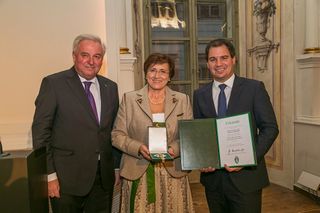 - Bei der Verleihung des Ehrenzeichen des Landes Steiermark, von links: Landeshauptmann Hermann Schützenhöfer, Bürgermeisterin der Marktgemeinde Gröbming a. D. Johanna Gruber und Landeshauptmann-Stellvertreter Michael Schickhofer.