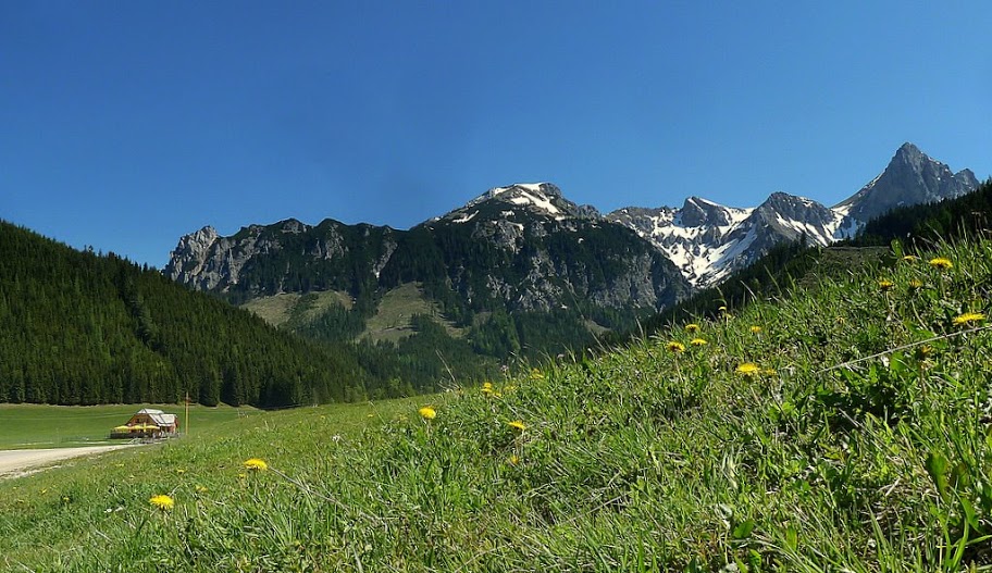 - Beim Parkplatz in der Kaiserau. Im Hintergrund die Reichensteingruppe.