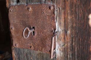 - Titel: Troadkostn außen. Kommentar der Einsenderin: Aufnahmeort: In dem zu unserem Hof gehörendem „Troadkostn", in 8903 Lassing, Burgfried 12. Der Hof trägt den vlg. – Namen: „Moar in der Feicht’n". Auf der Tür kann man die Jahrzahl 1639 lesen. Das Bild zeigt das Schloss mit Schlüssel von außen.