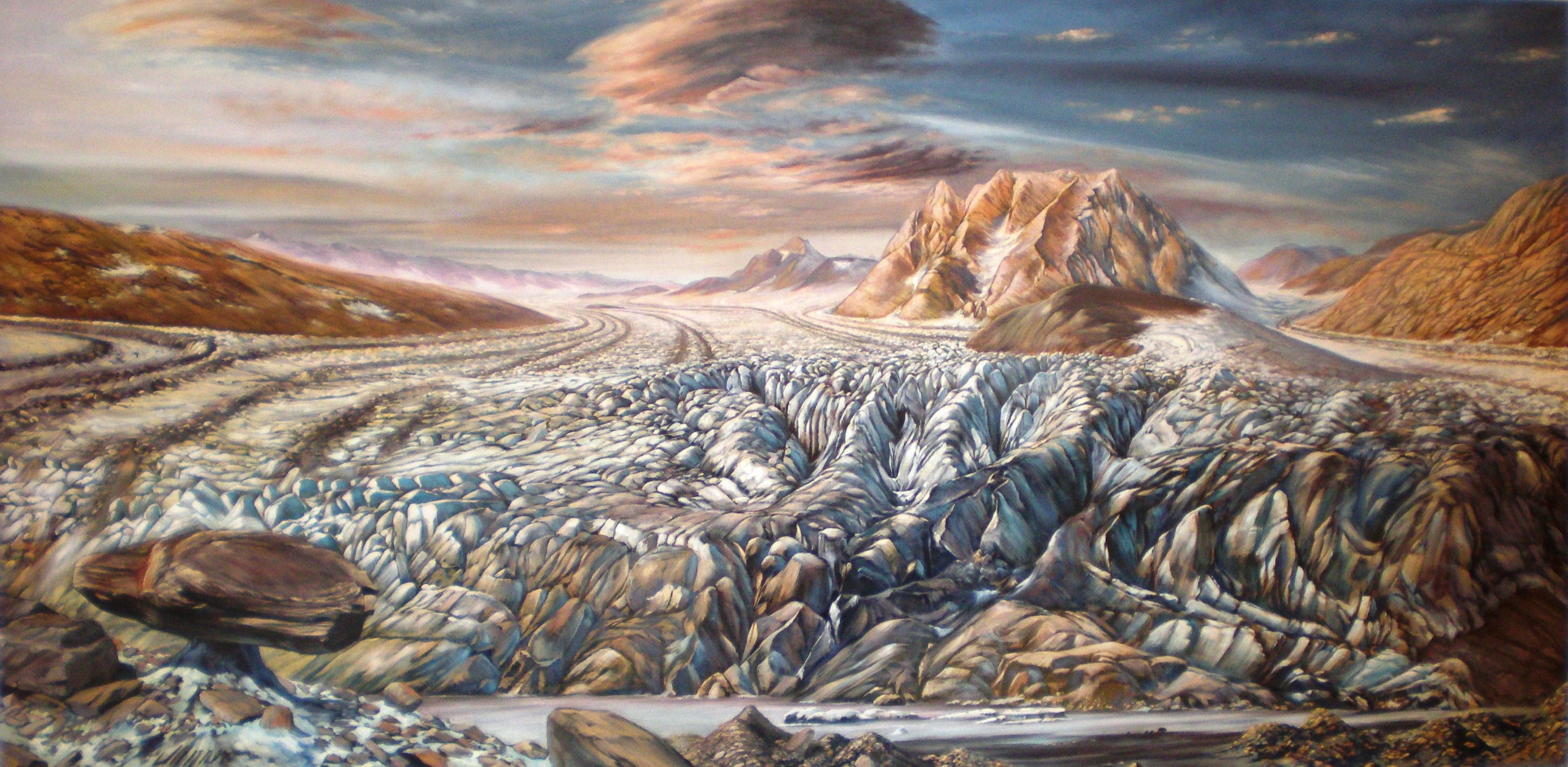 - Der Ennstalgletscher zieht sich zurück - der Kulm wird eisfrei (rechts im Bild) und im Hintergrund der markante Grimming (Ölbild auf Leinwand von Fritz Messner, 2016)