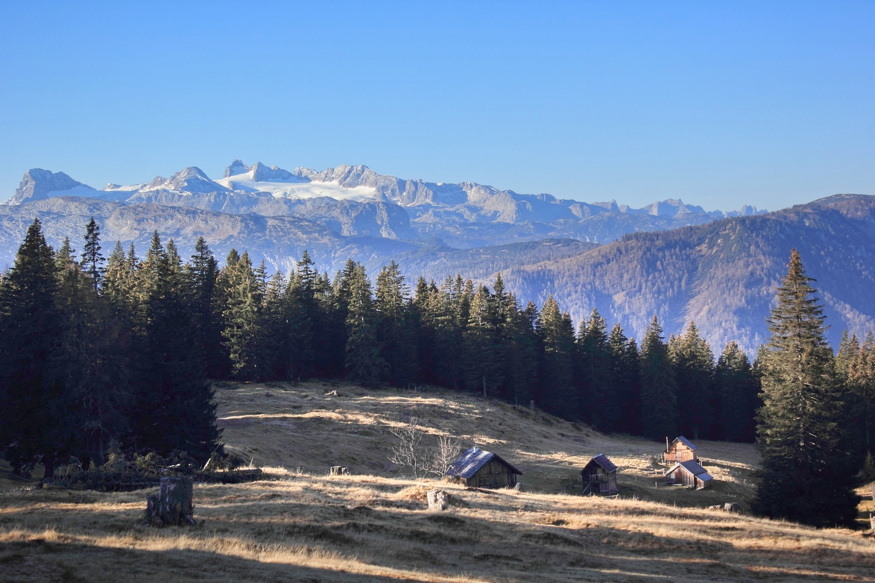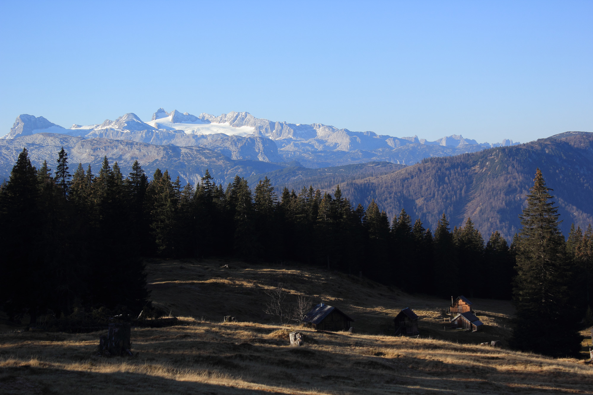 Die Langmoosalm im Nordwesten von Bad Mitterndorf mit dem Dachsteingebirge im Hintergrund.