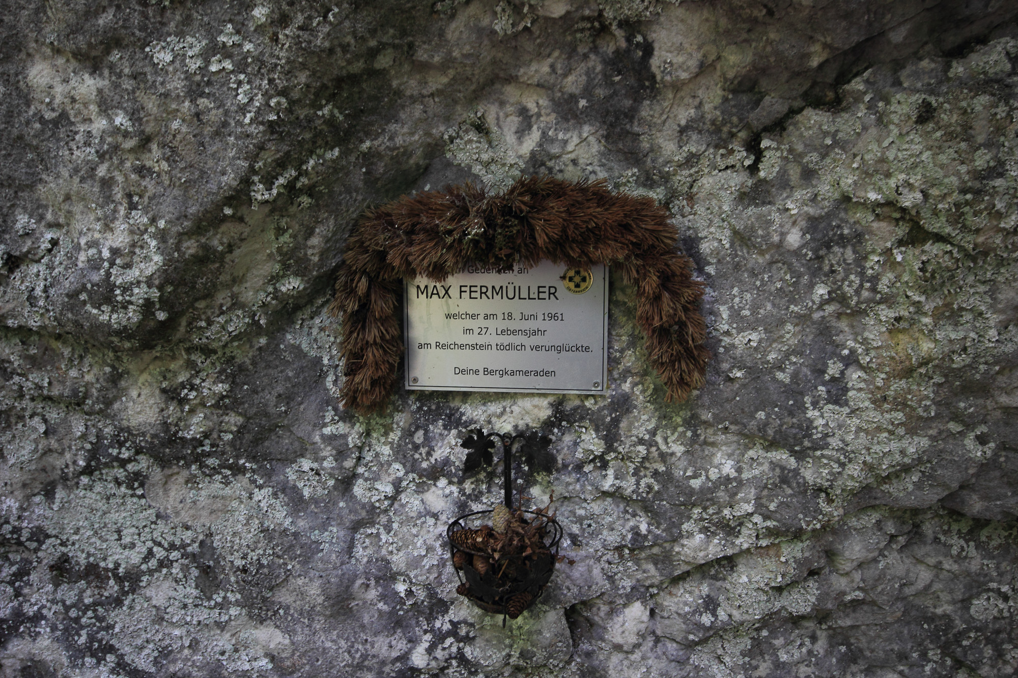- Die Gedenktafel Max Fermüller bei der Zimitzalm.