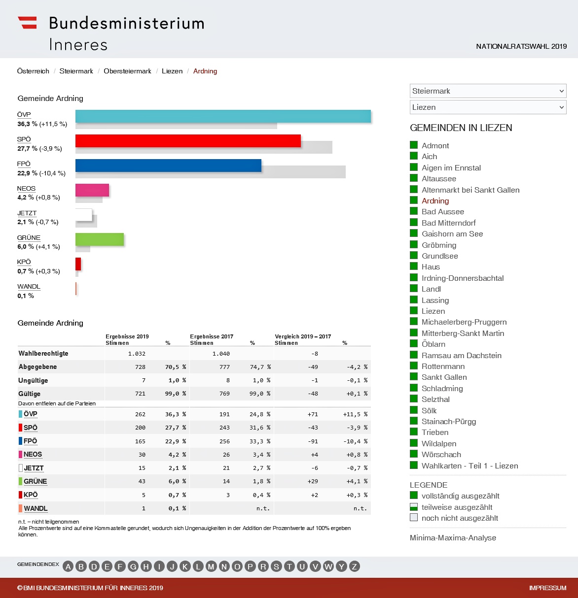 - Ergebnis der Nationalratswahl 2019 für die Gemeinde Ardning.