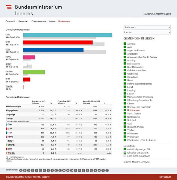 - Ergebnis der Nationalratswahl 2019 für die Stadtgemeinde Rottenmann.