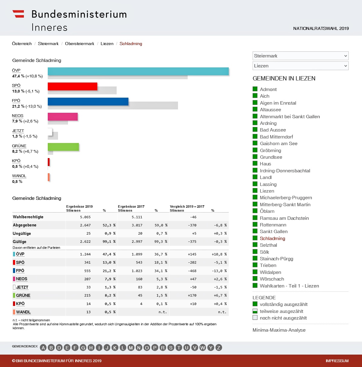 - Ergebnis der Nationalratswahl 2019 für die Stadtgemeinde Schladming.