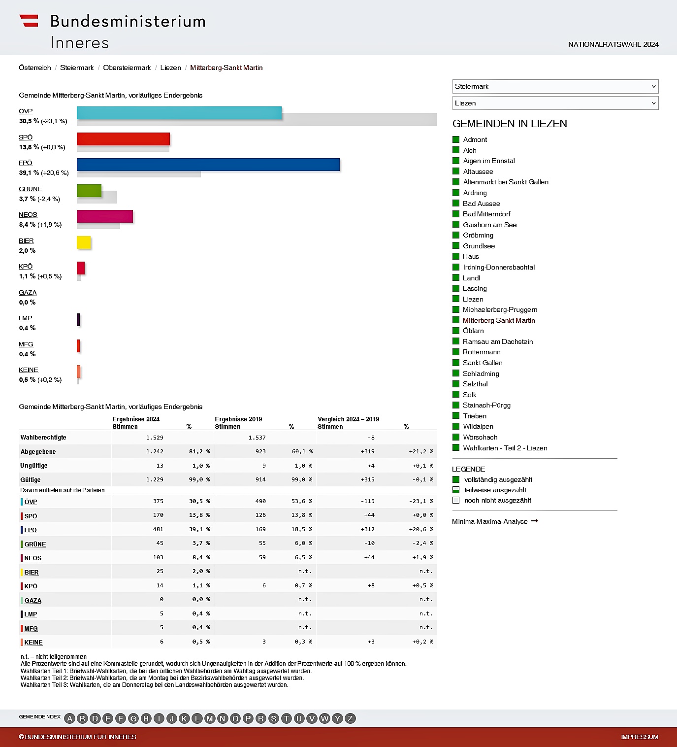 - Ergebnis der Nationalratswahl 2024 für die Gemeinde Mitterberg-Sankt Martin.
