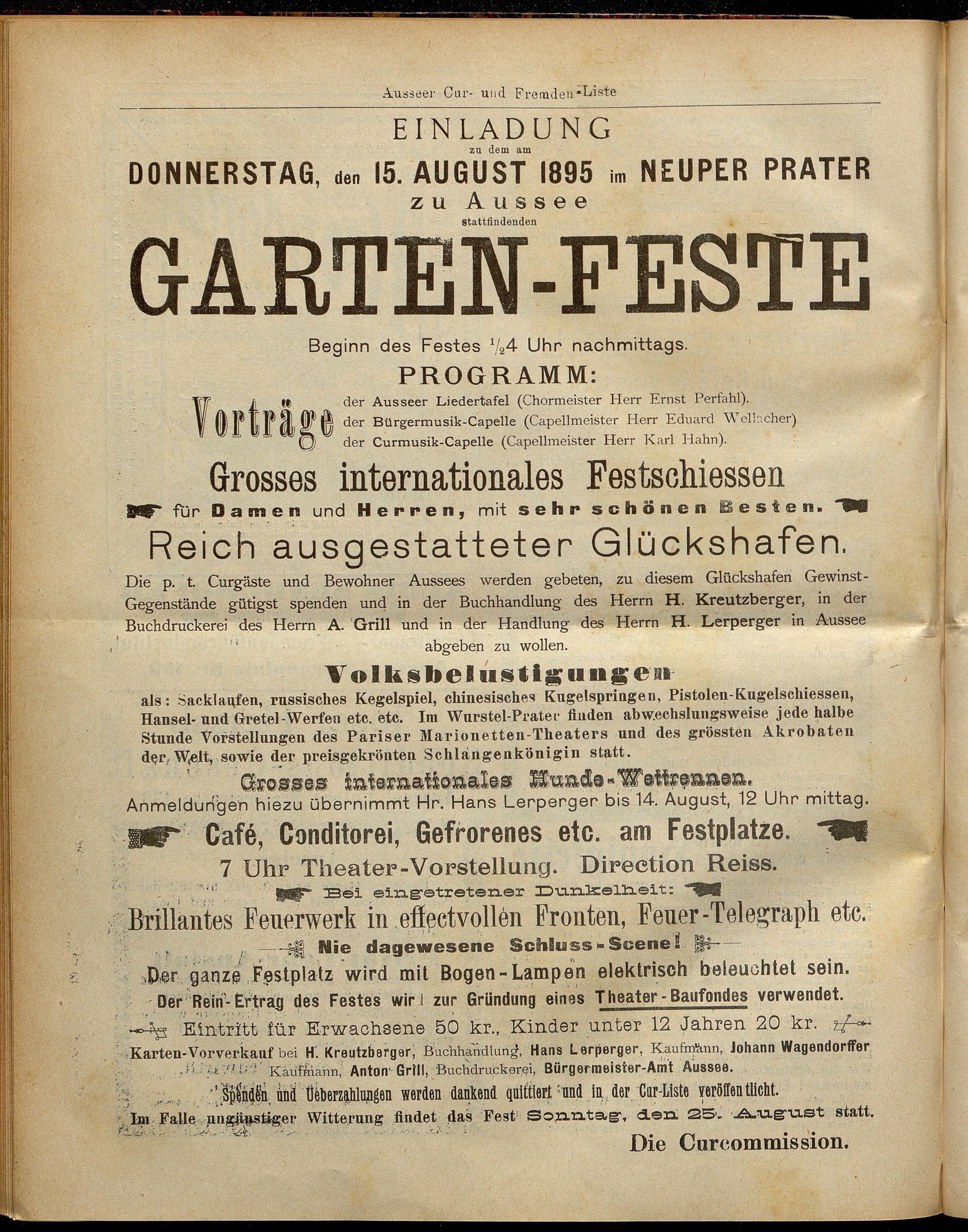 - Eine Einladung zum "Garten Feste" im Neuper Prater Aussee am 15. August 1895.