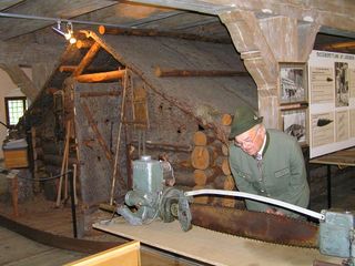 - der ehemalige Zimmerer begutachtet eine der ersten Motorsägen vor einer Original-Holzknechthütte