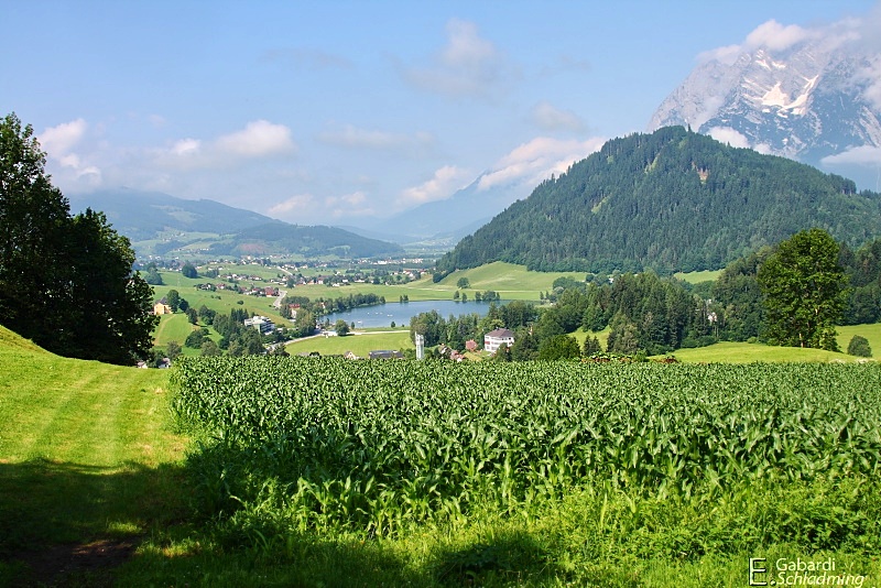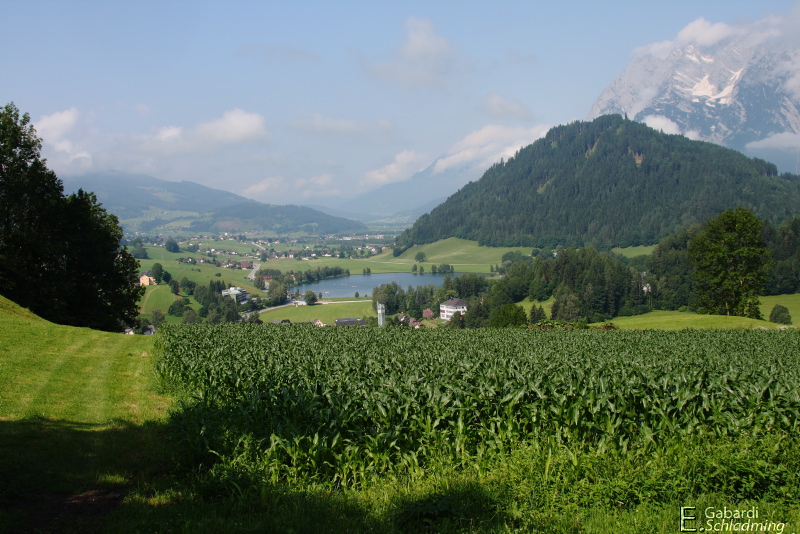 - Putterersee, Aigen im Ennstal, mit dem Kulm und dahinter der Grimmingstock.