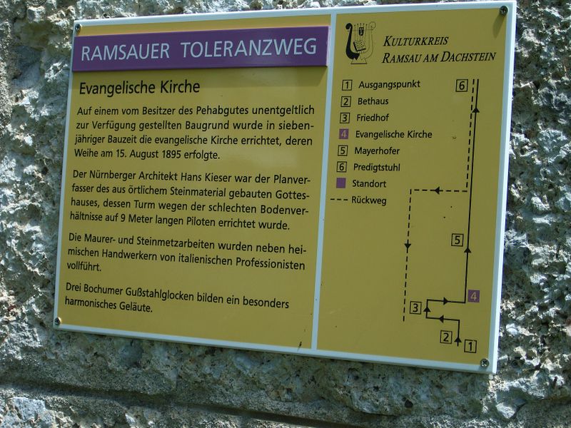 Ramsauer Toleranzweg, Infotafel bei der Evanglischen Pfarrkirche in Ramsau am Dachstein
