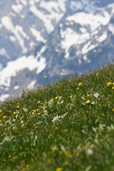 - Bergwiesen mit Dichternarzissen auf der Rantensteinalm, dahinter der Grimmingstock