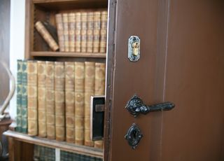 - Die Tür samt Schlösser zum historischen und weitgehend unverändert gebliebenen Turmzimmer bzw Lesezimmer im Schladminger Rathaus, ehemals Jagdschloss Coburg mit Büchern des dort ehemals wohnhaften Prinzen Sachsen-Coburg und Gotha im Hintergrund.