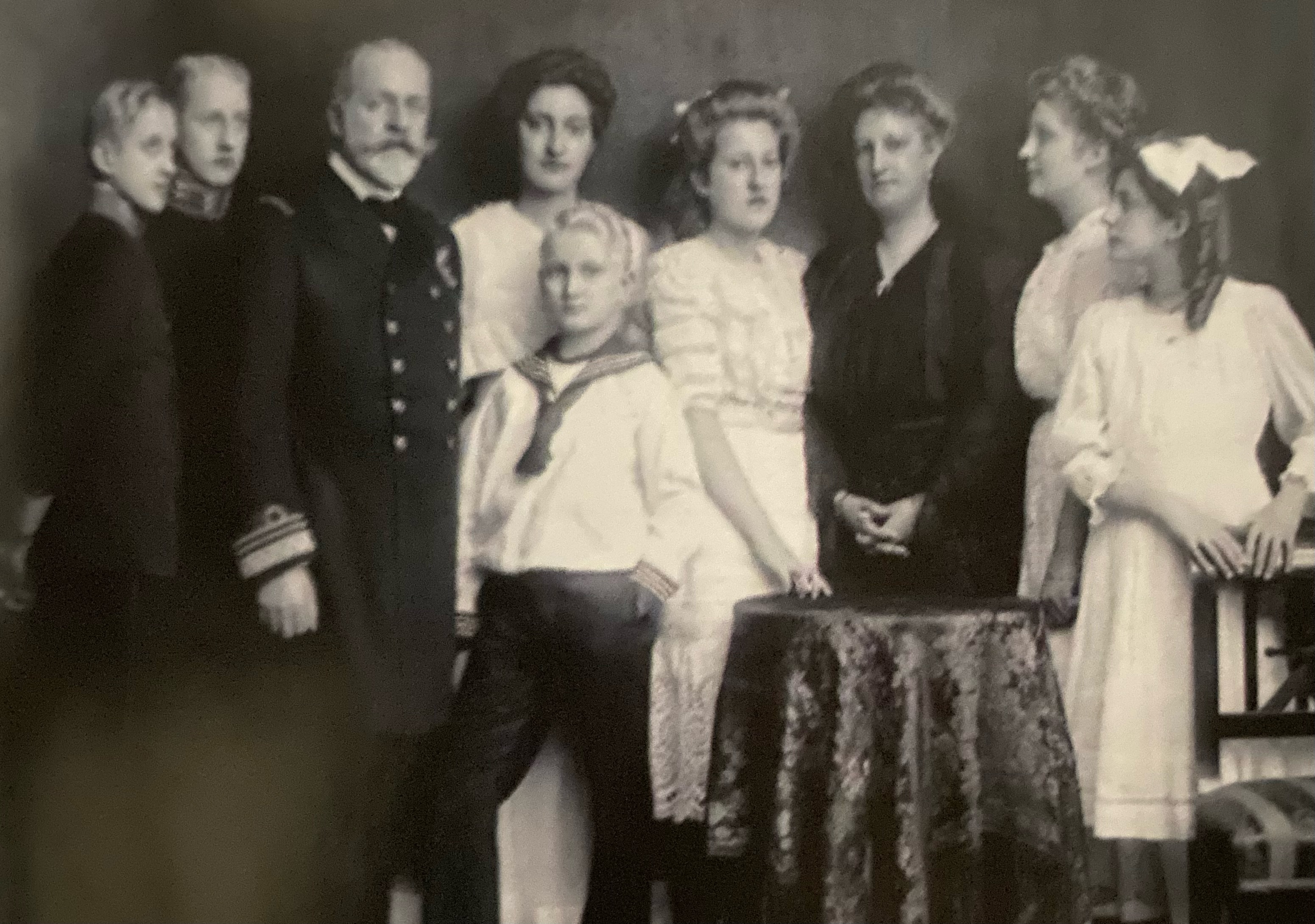 - Mitglieder des Fürstenhauses Sachsen-Coburg und Gotha: August Leopold Prinz von Sachsen-Coburg und Gotha (links mit Schnauzer) und Maria Karoline von Sachsen-Coburg und Gotha, Zweite von rechts, vermutlich ebenfalls auf dem Bild die Mutter und die weiteren Kinder.