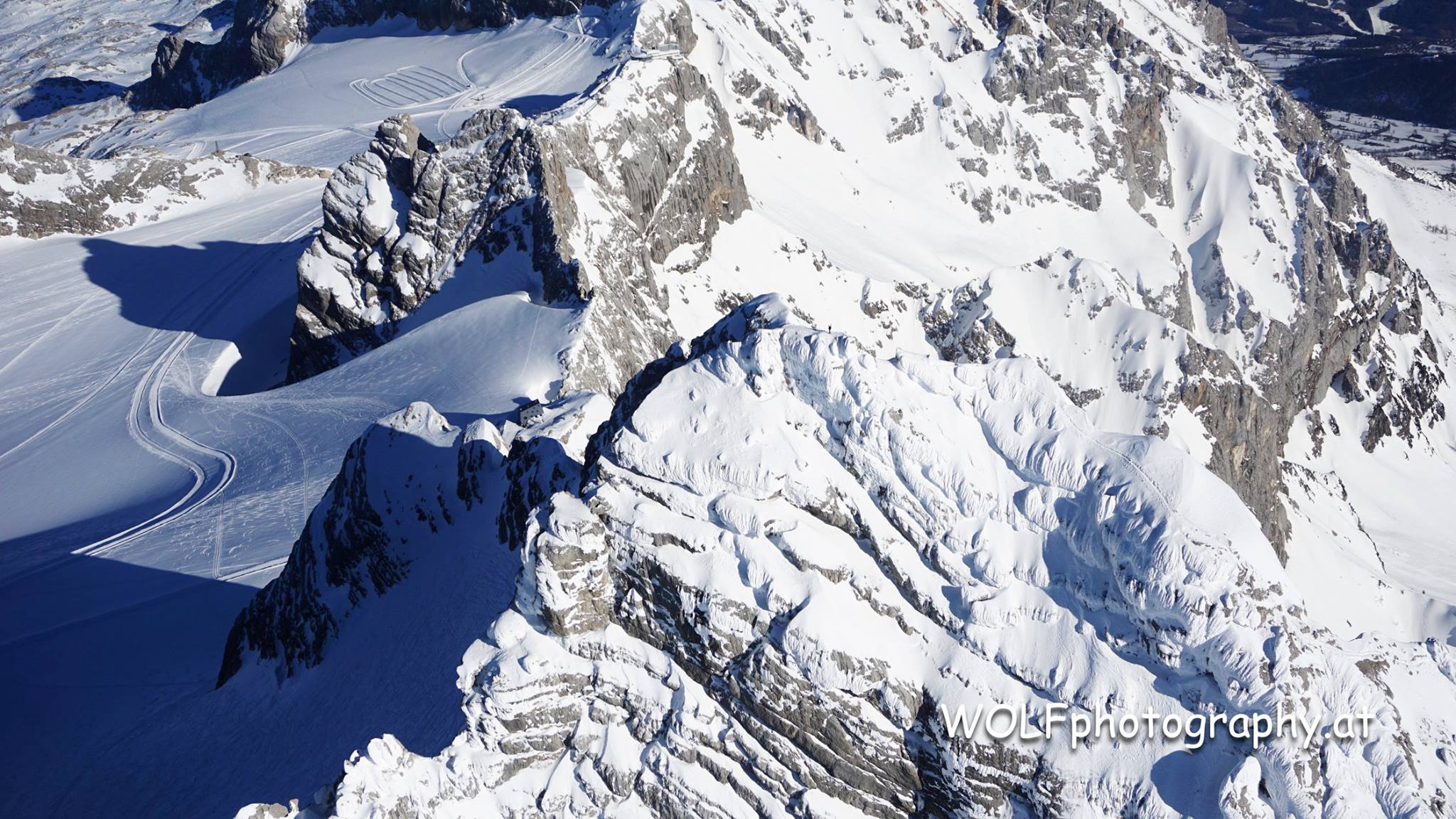 - Dachsteinflug am 31. März 2019: Bildrand oben fast Mitte der Hunerkogel mit Bergstation Dachstein Gletscherbahn, darunter sieht man die Dachsteinwartehütte und rechts davon wieder der Hohe Dachstein.