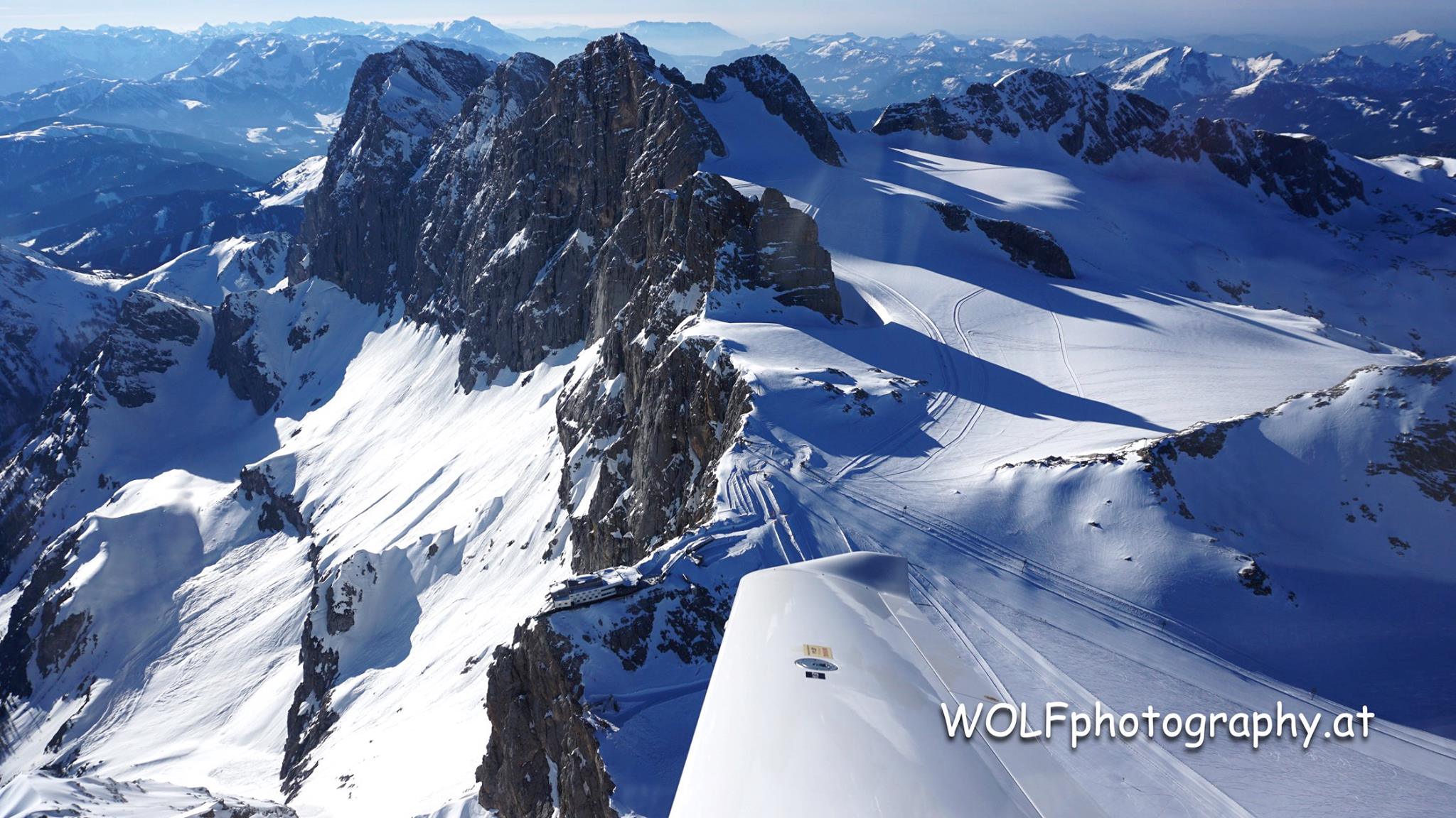 - Dachsteinflug am 31. März 2019: Links von der Tragflügelspitze ist Bergstation der Dachstein-Gletscherbahn am Hunerkogel, Bildmitte oben der Hohe Dachstein. Links die Steiermark (die Ramsau) rechts Oberösterreich.