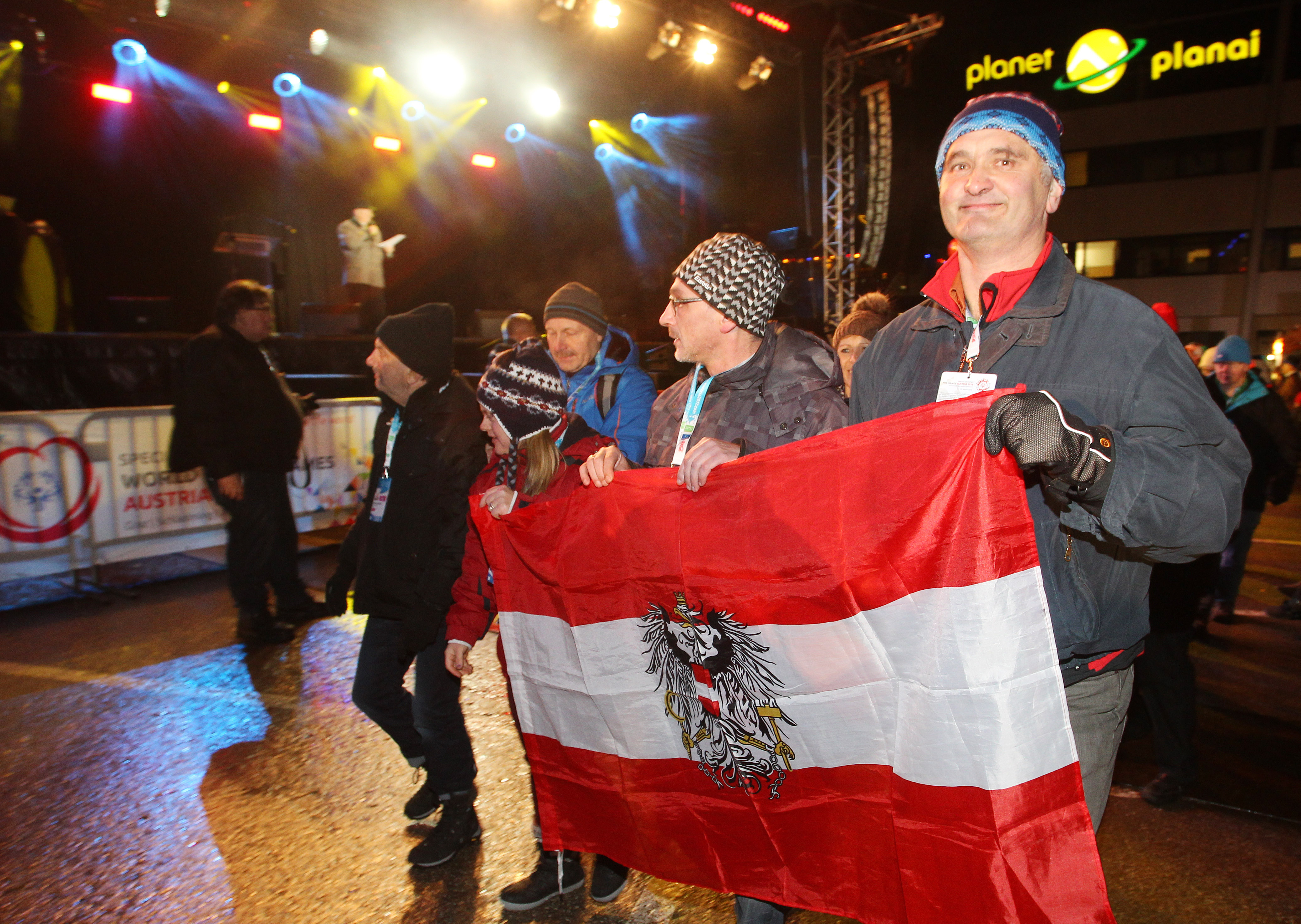 - Generalprobe für die Special Olympics World Winter Games 2017 in Schladming im Jänner 2016: ein Bild von der Eröffnungszeremonie: österreichische Athleten mit der österreichischen Fahne.