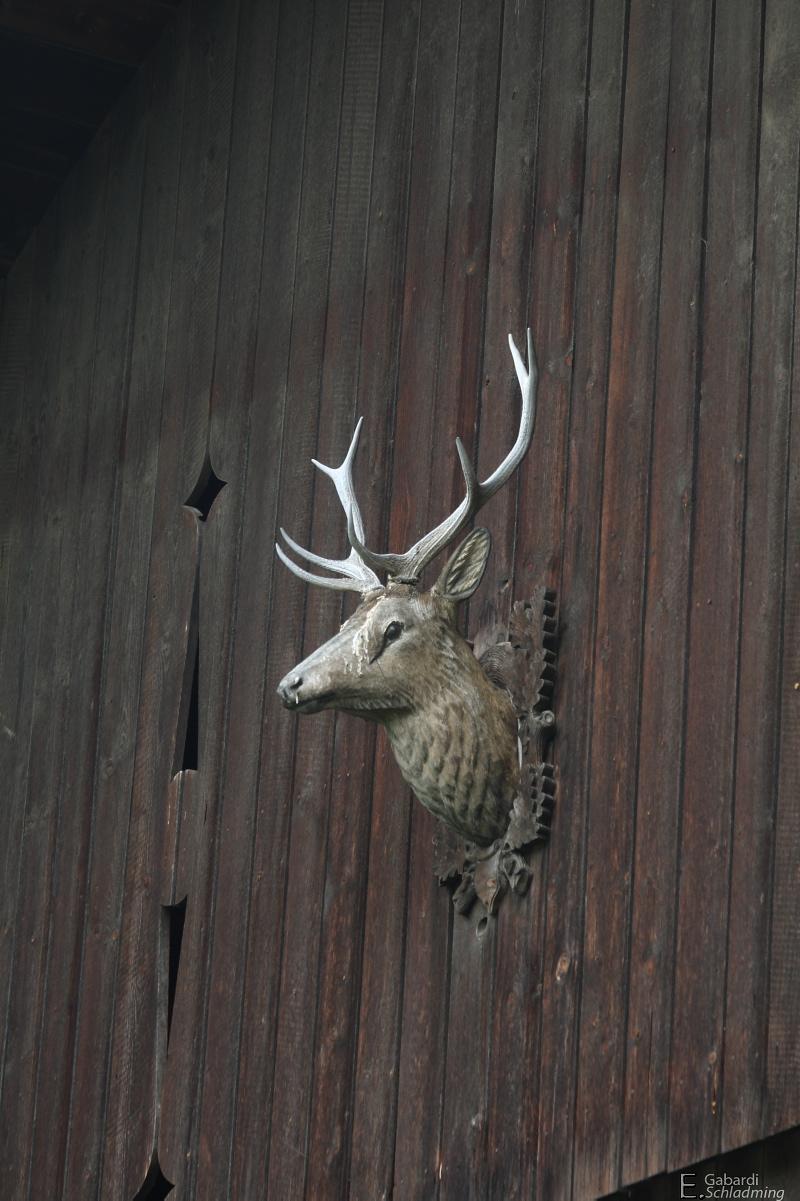 - Steinlechnerhof, Schladming, Hirschtrophäe an der Stallwand