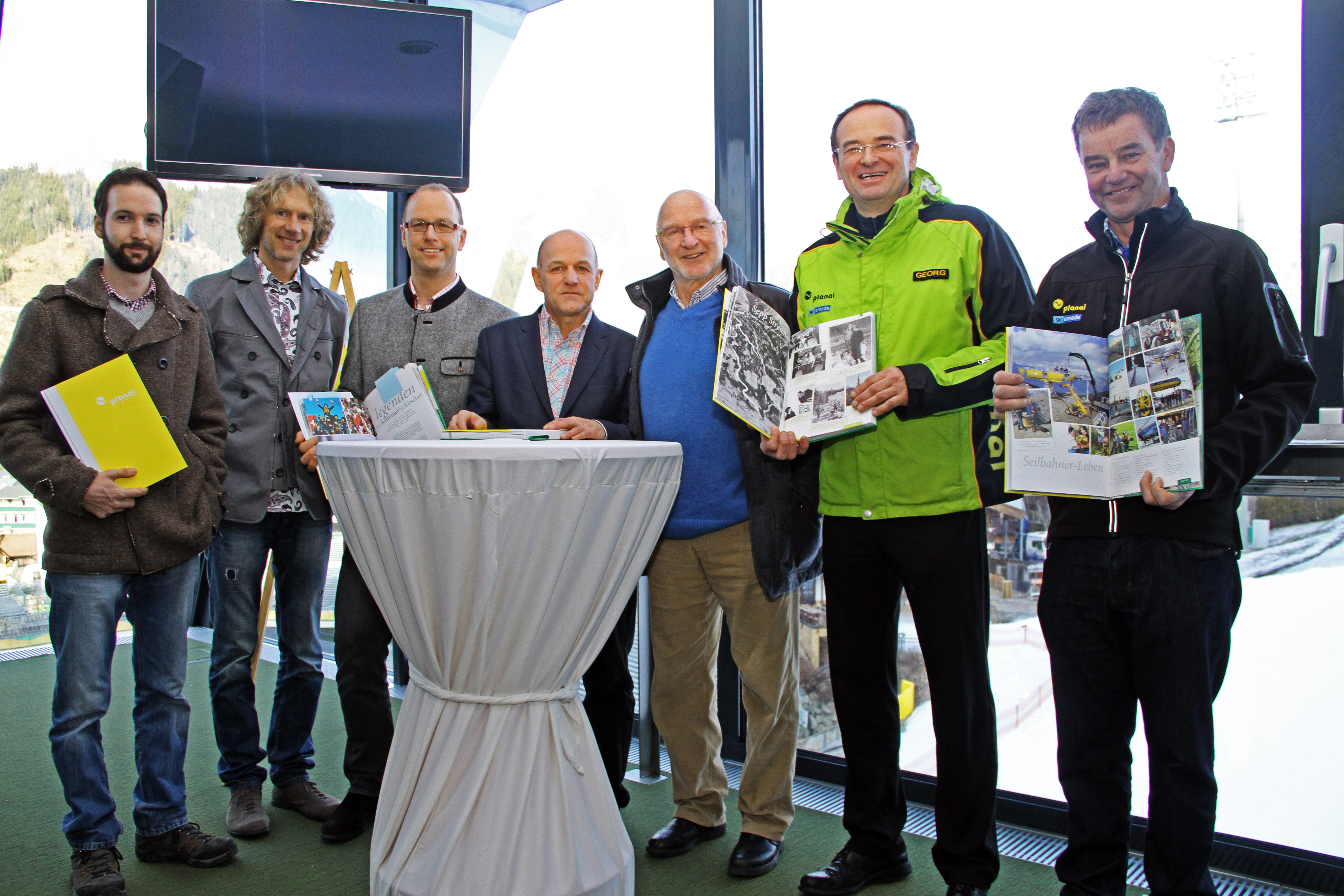 - Präsentation des Buches start.ziel: v.li.: Christian Rettenbacher, Martin Hutegger, Martin Huber, Peter Gruber, Albert Baier, Planai-Geschäftsführer Georg Bliem und Prokurist Karl Höflehner präsentierten das Buch „start.ziel" im voestalpine skygate direkt am legendären Zielhang der Planai.