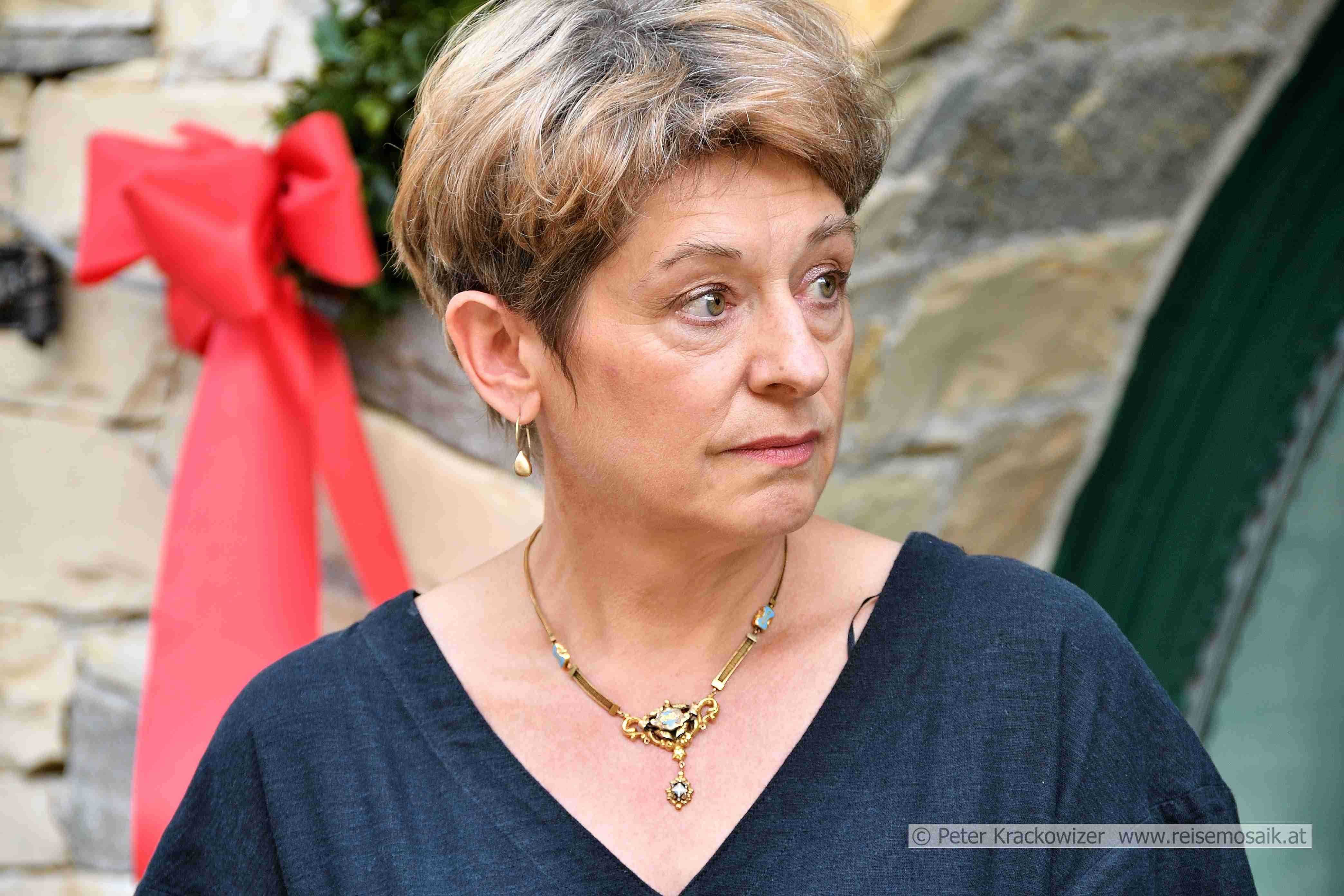 Stolpersteinverlegungen in Schladming im Juli 2023 im Hotel Pichlmayrgut in Schladming-Pichl. Dr. Kate Robinson aus Schottland, Nachfahrin von Hans Fröhlich, trägt ein Collier als Erinnerung an ihre Ururgroßmutter Alice Fröhlich.